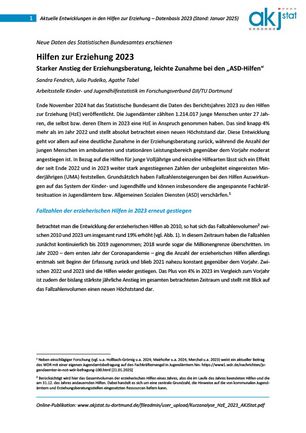 Für das Arbeitsfeld der Hilfen zur Erziehung besteht mit der amtlichen Kinder- und Jugendhilfestatistik ein umfassendes und bewährtes Instrument einer empirischen Dauerbeobachtung. Die Internetseite des „Monitor Hilfen zur Erziehung“ nutzt diese Datengrundlage und stellt Analysen zum aktuellen Stand sowie zu Entwicklungen im Feld der Hilfen zur Erziehung dar. Bei dieser Internetseite handelt es sich um eine Weiterentwicklung der Veröffentlichungen „Monitor Hilfen zur Erziehung 2012“, „Monitor Hilfen zur Erziehung 2014“, „Monitor Hilfen zur Erziehung 2016", „Monitor Hilfen zur Erziehung 2018", „Monitor Hilfen zur Erziehung 2021" und „Monitor Hilfen zur Erziehung 2023" mit einer Aktualisierung der in den Publikationen enthaltenen Grundauswertungen zu den Fallzahlen und der Inanspruchnahme von Hilfen zu Erziehung sowie zu den Ausgaben für diesen Arbeitsbereich.