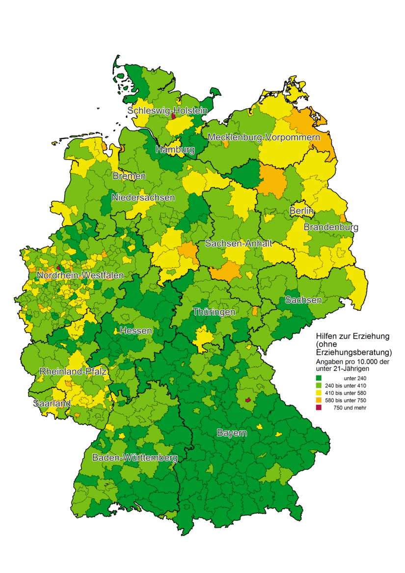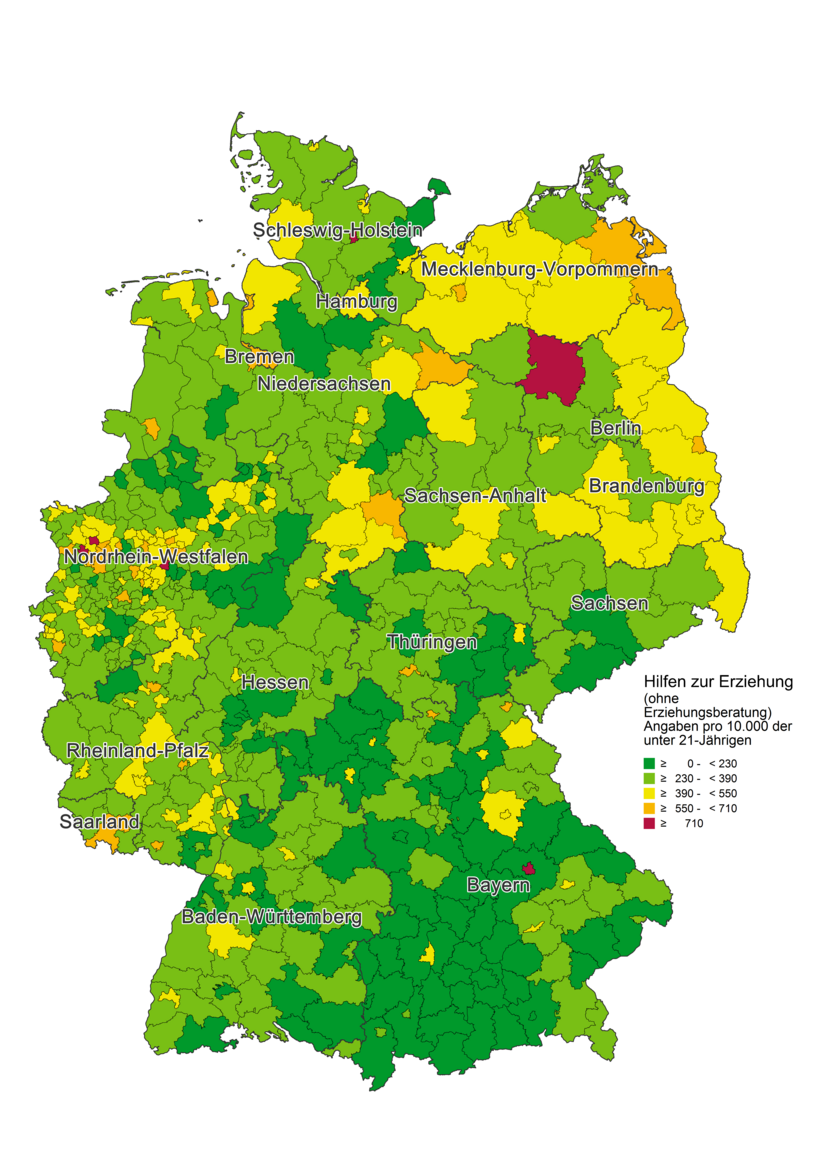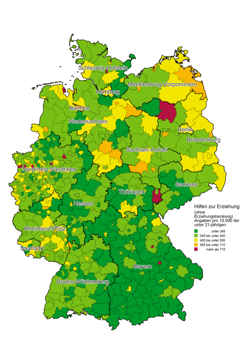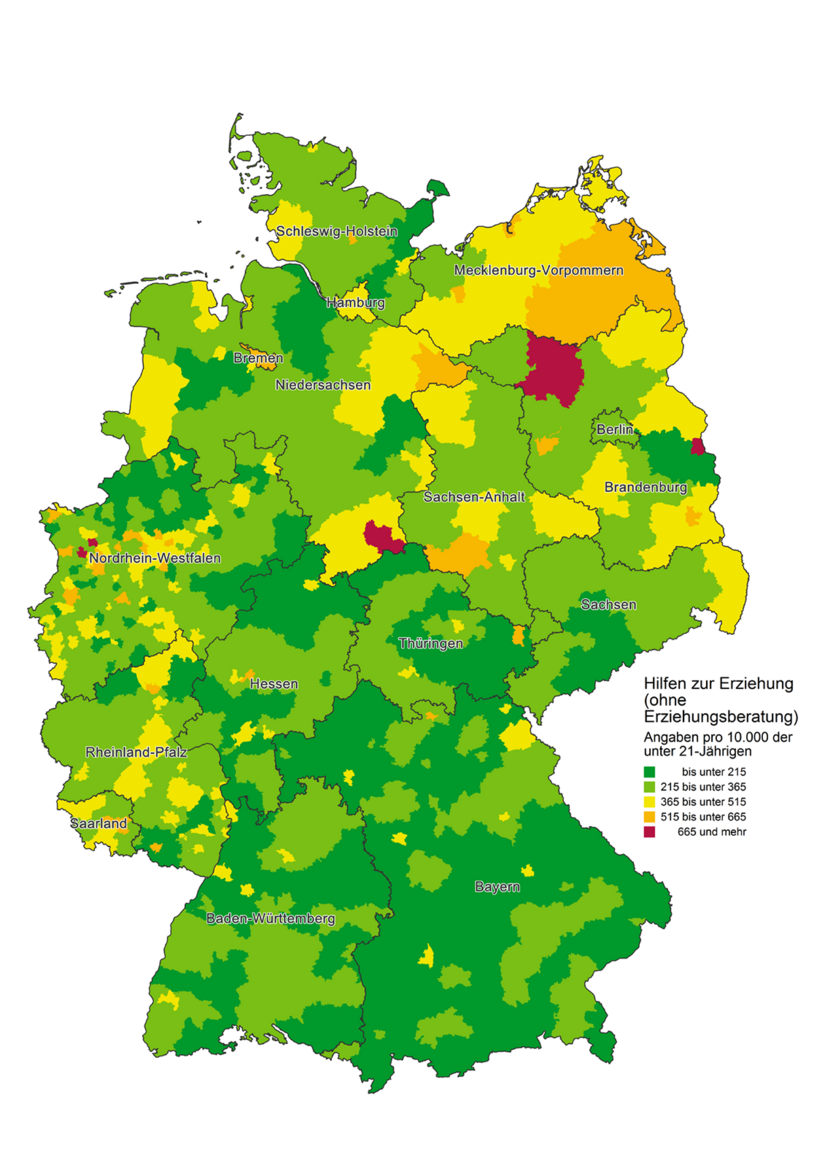 Die Karte verdeutlicht, dass die Jugendamtsbezirke mit den höchsten Inanspruchnahmequoten im Norden, insbesondere im Nordosten Deutschlands liegen. Auch im Westen, etwa in den Ballungsräumen Nordrhein-Westfalens sind häufiger überdurchschnittliche Inanspruchnahmequoten zu verzeichnen. In Bayern hingegen ist der mit Abstand größte Anteil von Jugendämtern mit eher niedrigen Inanspruchnahmequoten zu erkennen.