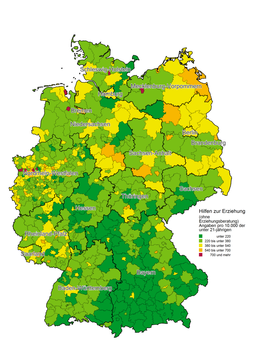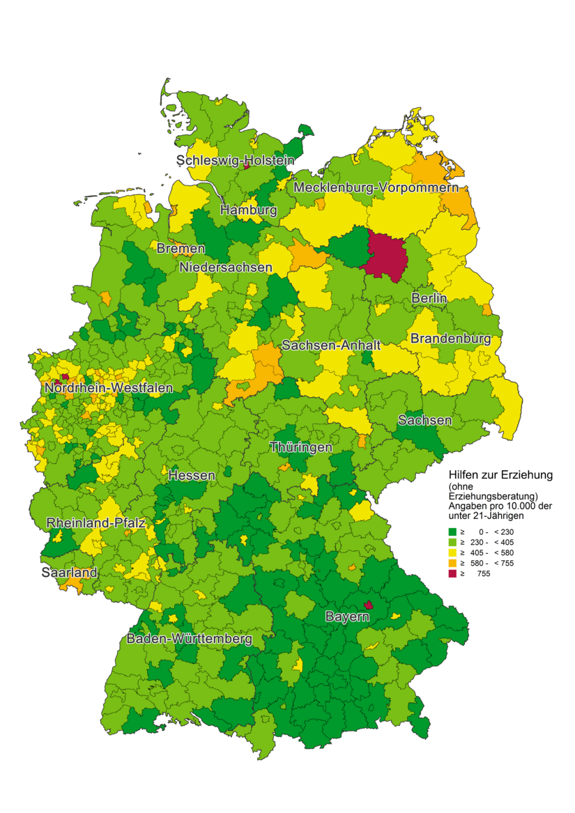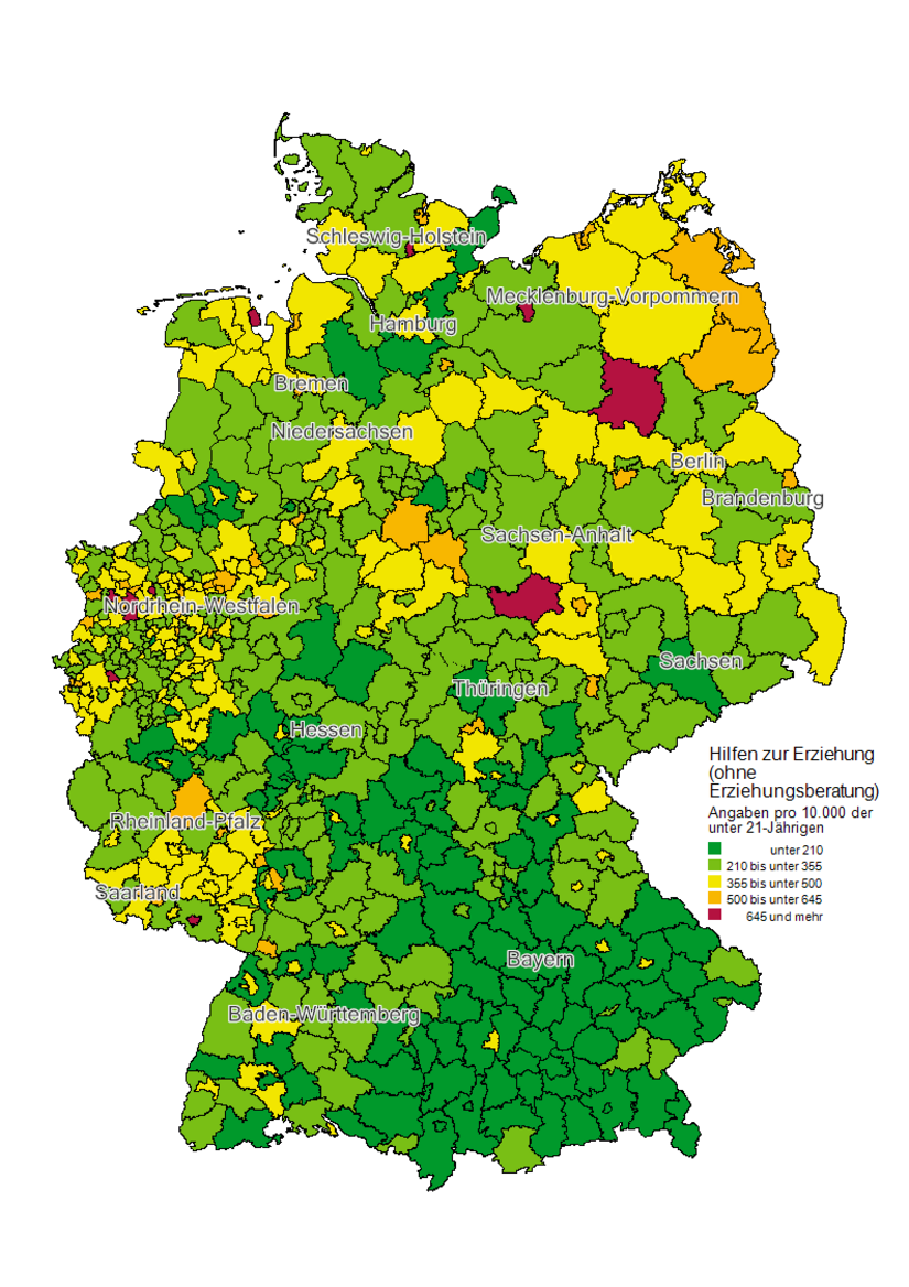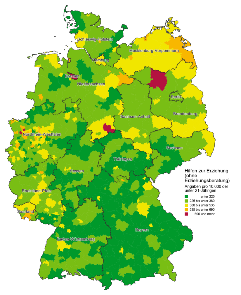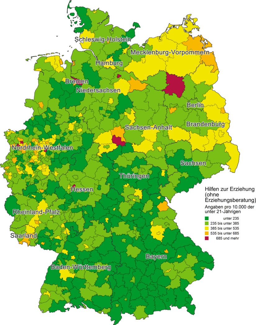 Die Karte verdeutlicht, dass die Jugendamtsbezirke mit den höchsten Inanspruchnahmequoten im Norden, insbesondere im Nordosten Deutschlands liegen. Auch im Westen, etwa in den Ballungsräumen Nordrhein-Westfalens sind häufiger überdurchschnittliche Inanspruchnahmequoten zu verzeichnen. In Bayern hingegen ist der mit Abstand größte Anteil von Jugendämtern mit eher niedrigen Inanspruchnahmequoten zu erkennen.